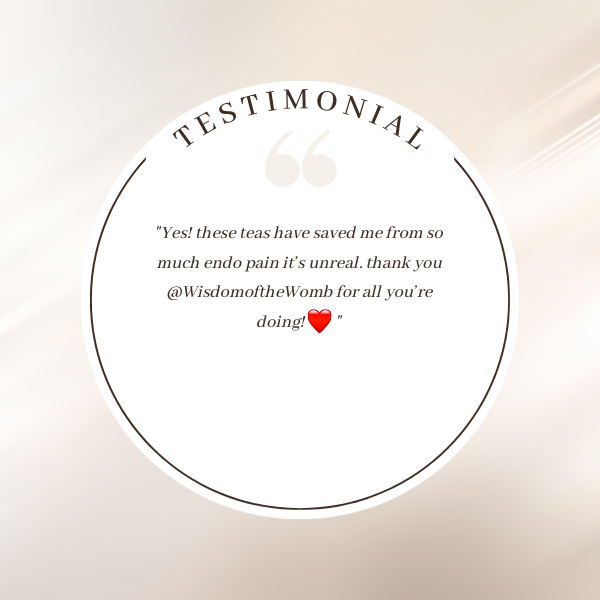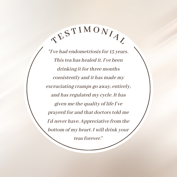 "I have had endometriosis for 15 years. This tea has healed it. I've been drinking it for three months consistently and it has made my excruciating cramps go away entirely and has regulated my cycle. It has given me a quality of life I've prayed for and that doctors told me I'd never have. Appreciative from the bottom of my heart. I will drink your teas forever."