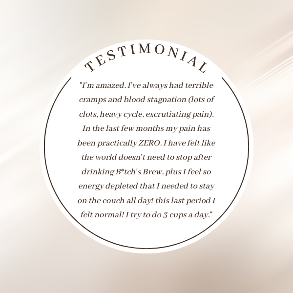"I'm amazed. I've always had terrible cramps and blood stagnation (lots of clots, heavy cycle, excruciating pain). In the last few months my pain has been practically ZERO. I have felt like the world doesn't need to stop after drinking B*tch's Brew, plus I feel so energy depleted that I needed to stay on the couch all day. This last period I felt normal! I try to do 3 cups a day."