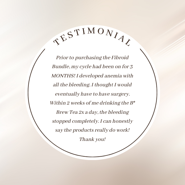 "Prior to purchasing the Fibroid Bundle, my cycle had been on for 3 MONTHS! I developed anemia with all the bleeding. I thought I would eventually have to have surgery. Within 2 weeks of me drinking the B* Brew Tea 2x a day, the bleeding stopped completely. I can honestly say the products really do work! Thank you!"